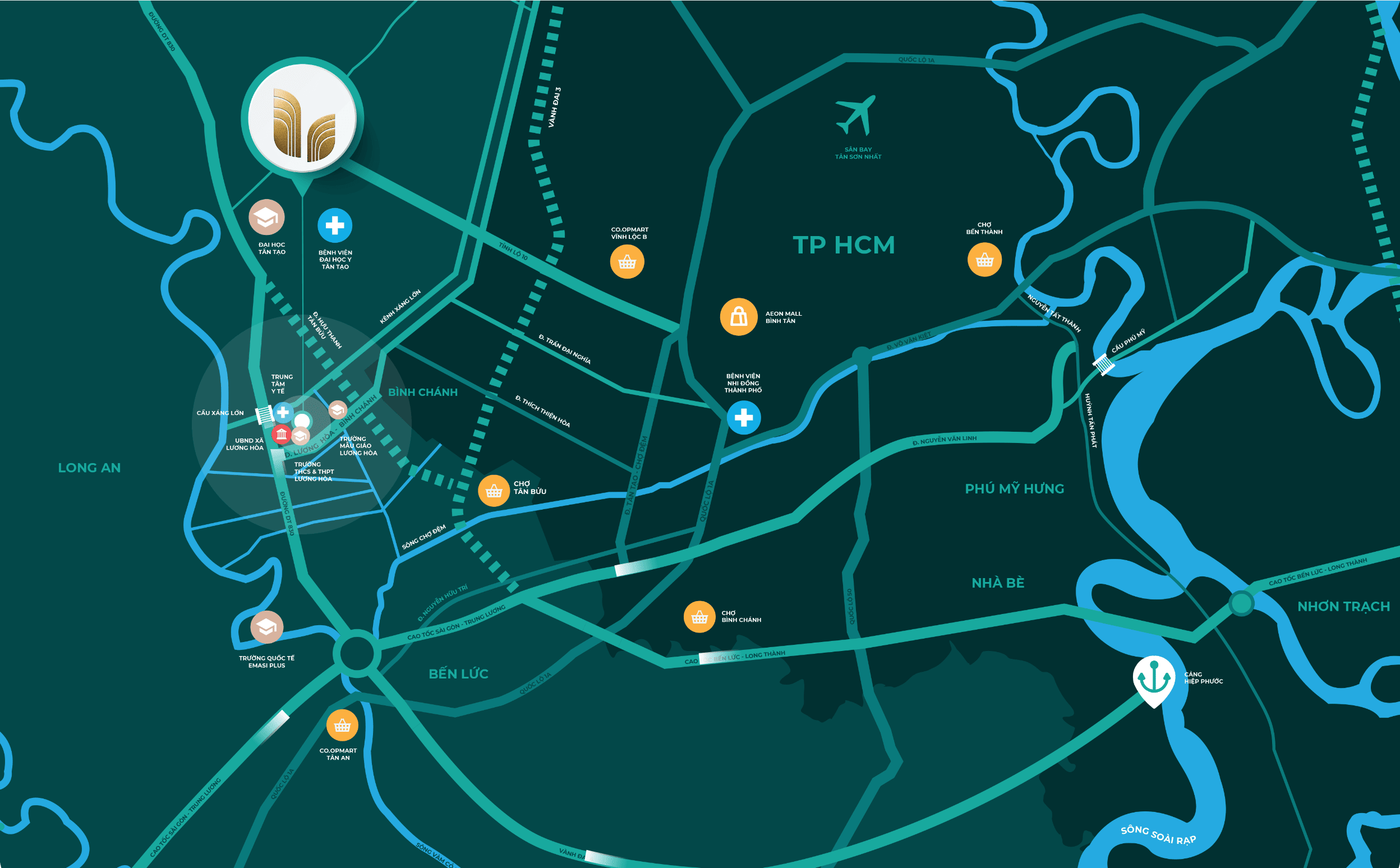 • Nằm gần nút giao của 2 tuyến cao tốc Sài Gòn – Trung Lương và Bến Lức – Long Thành, tuyến giao thông quan trọng kết nối TP. Hồ Chí Minh với các tỉnh miền Tây.