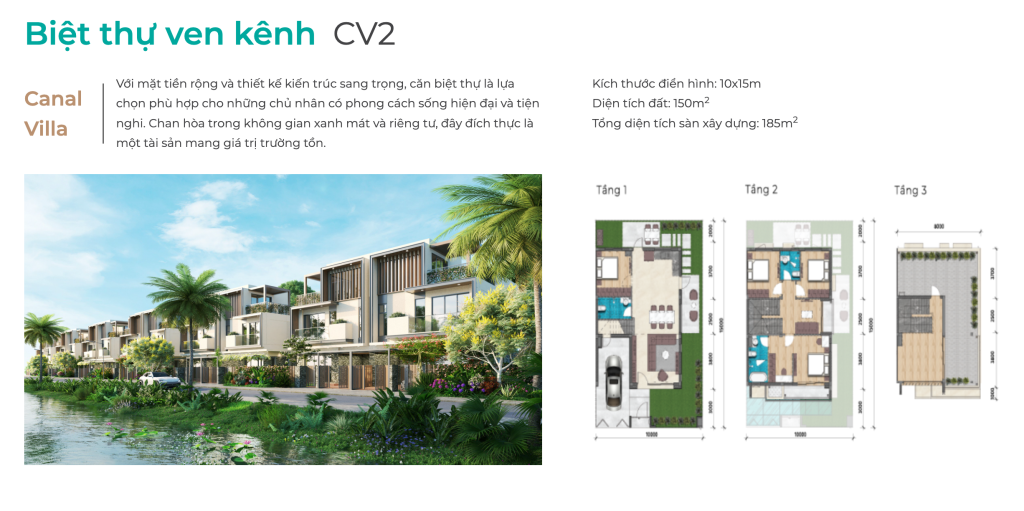 • Biệt thự view kênh: 144m – 162m xây dựng 1 trệt 2 lầu